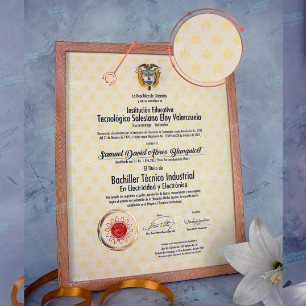 •Escudo del Colegio a color y con matasello dorado. (Opcional placa metálica del Colegio).