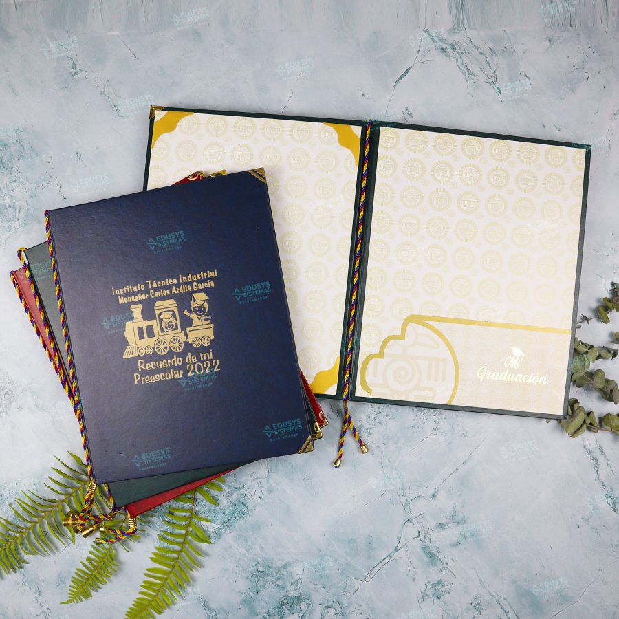 CARPETA PASTA DURA 1/8 8 Elaborada con cartón dos milímetros, forrada en papel de encuadernación, punteras doradas, cordón tricolor con punteras doradas, esquineros dorados para diploma, bolsillo para diploma y marcada en dorado con nombre, escudo del colegio y promoción.