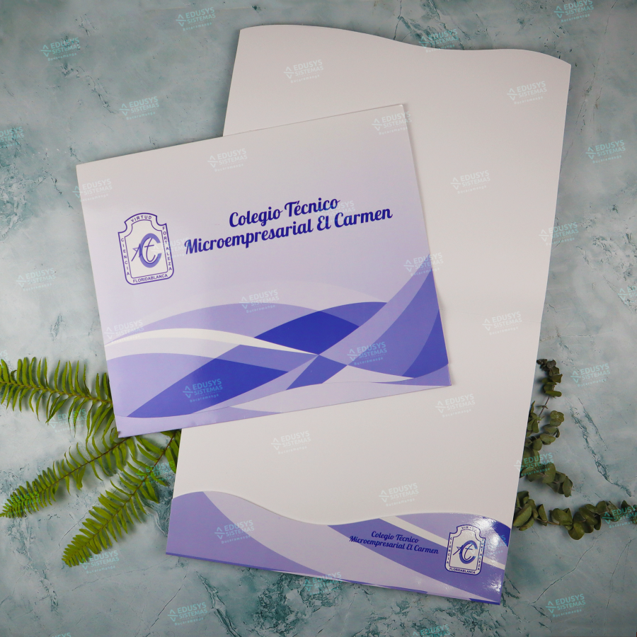 CARPETA TRES CUERPOS 1/6 Personalizada, elaborada en papel propalcote 250 gms, plastificada con bolsillo para diploma y para acta, impresa a una tinta marcada con nombre y escudo del colegio.