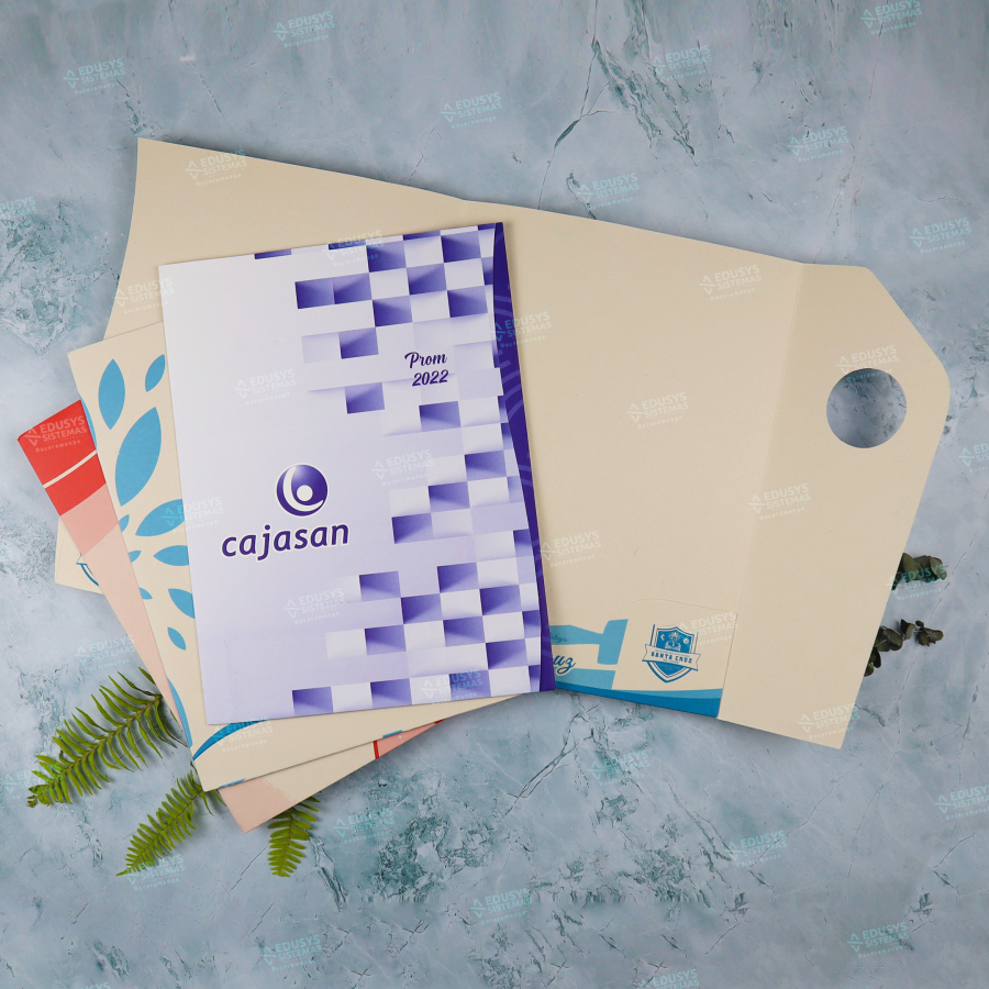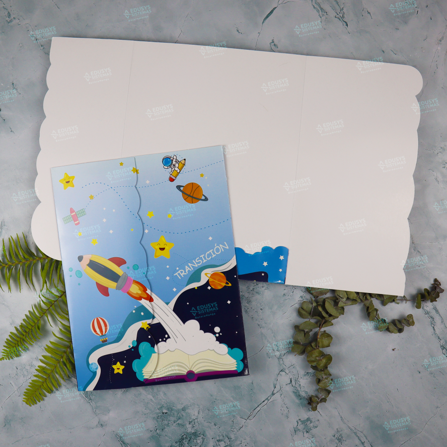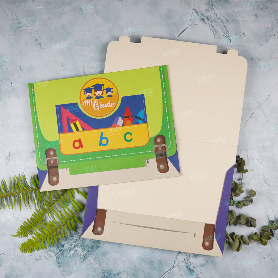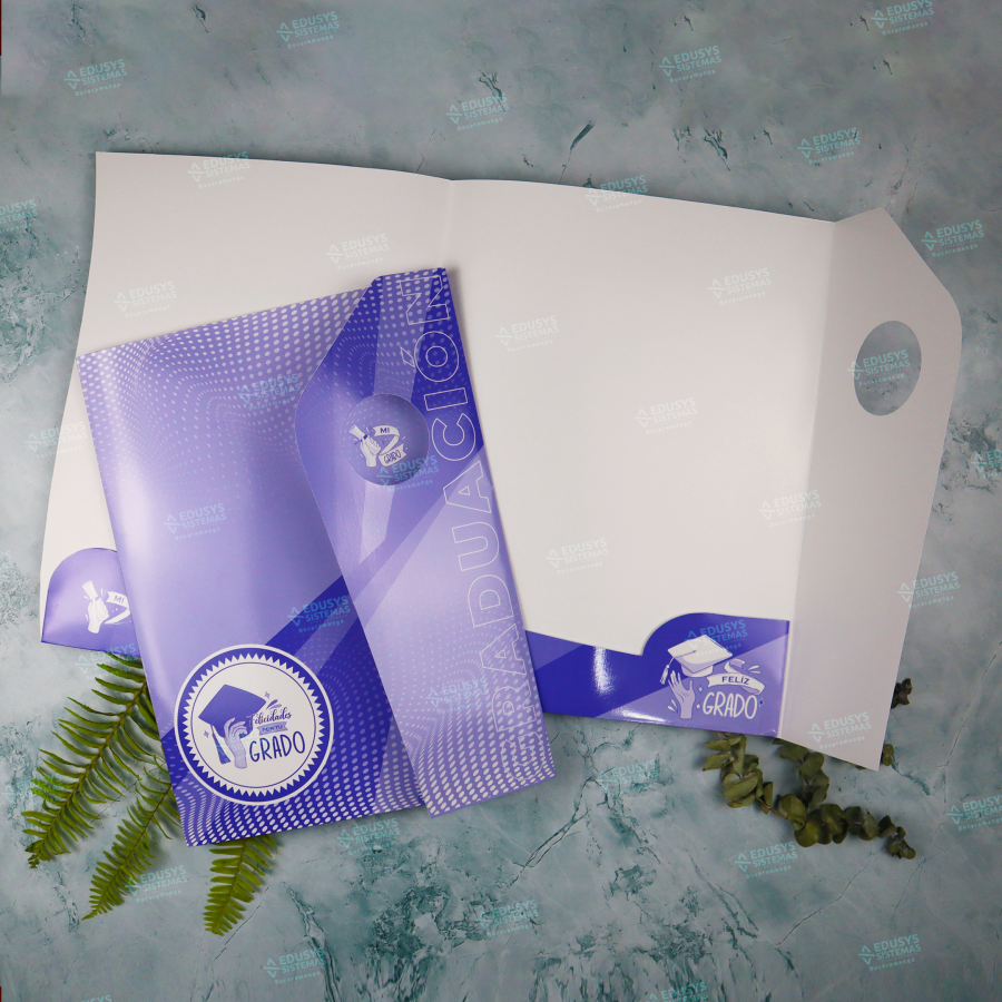 CARPETA TRES CUERPOS PERSONALIZADA 1/8 elaborada en papel Avorio de 250 gr con bolsillo para diploma y bolsillo para acta, impresa a una tinta marcada con nombre y escudo del colegio.