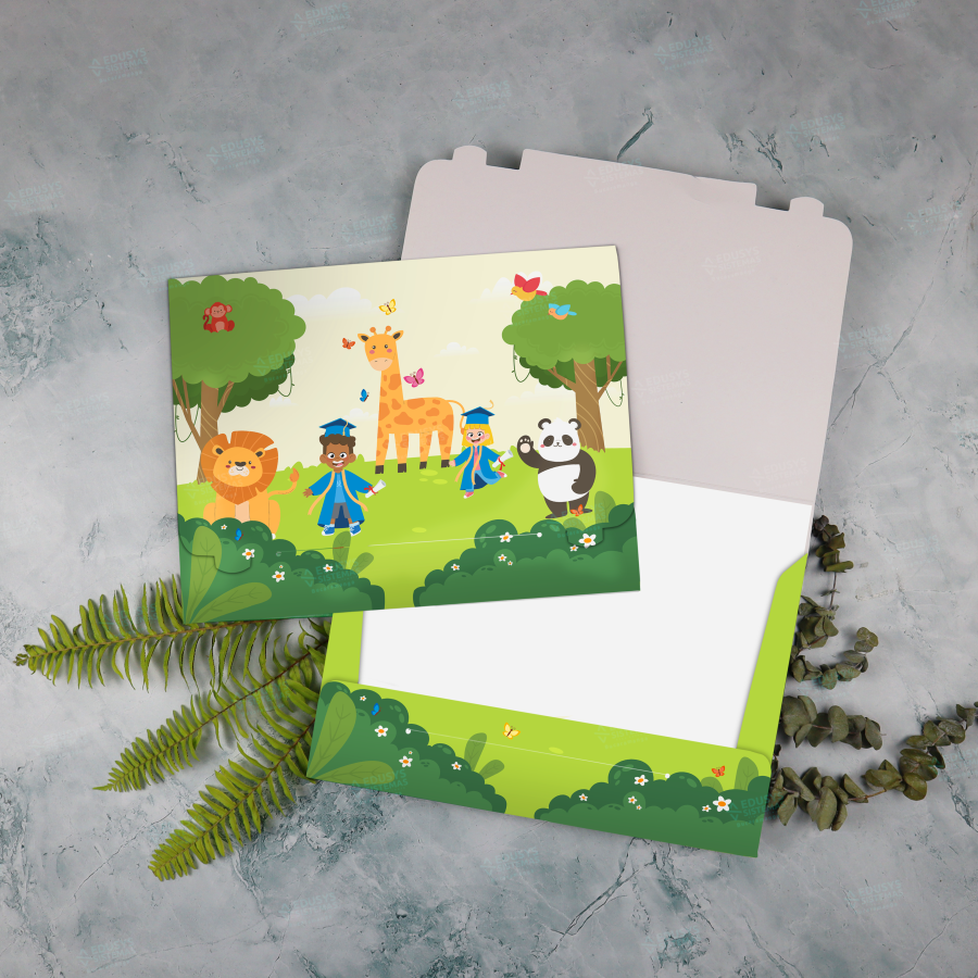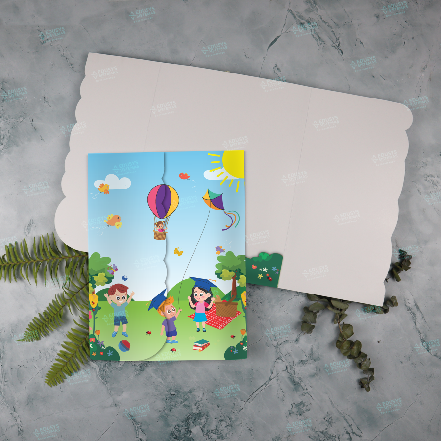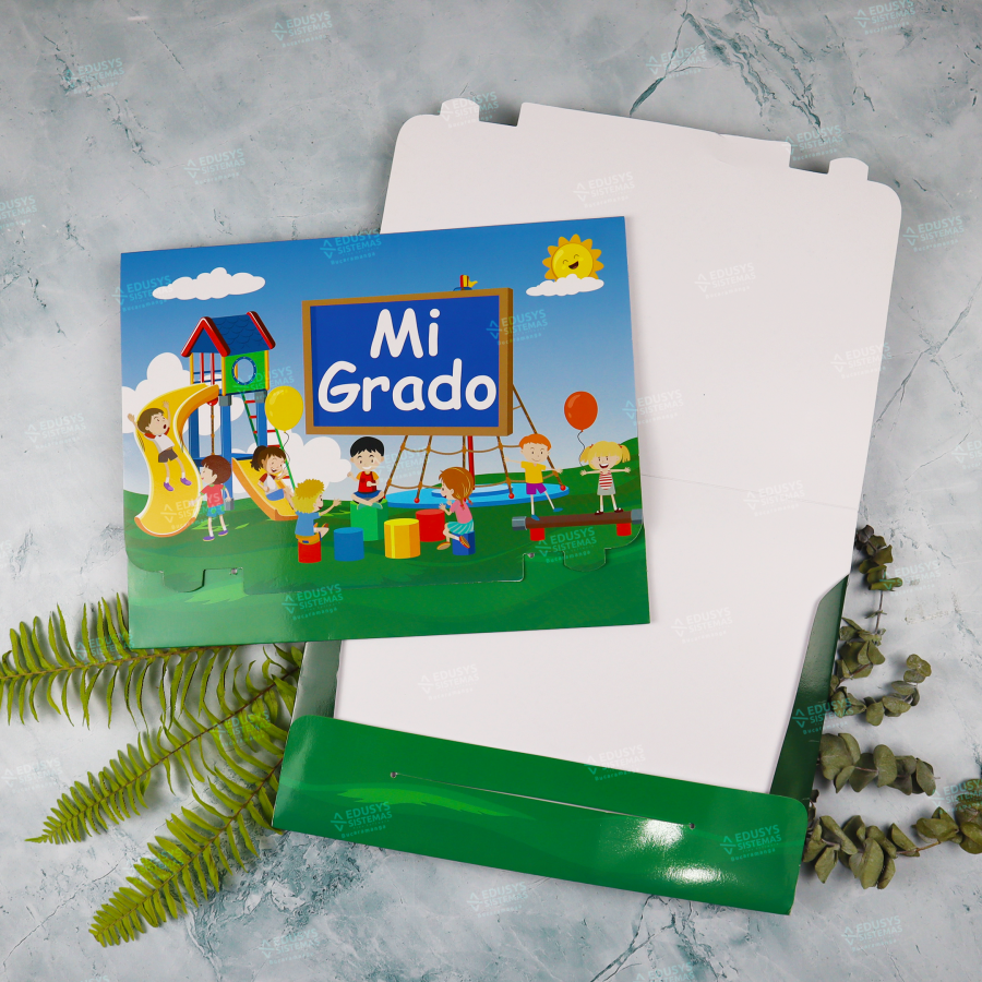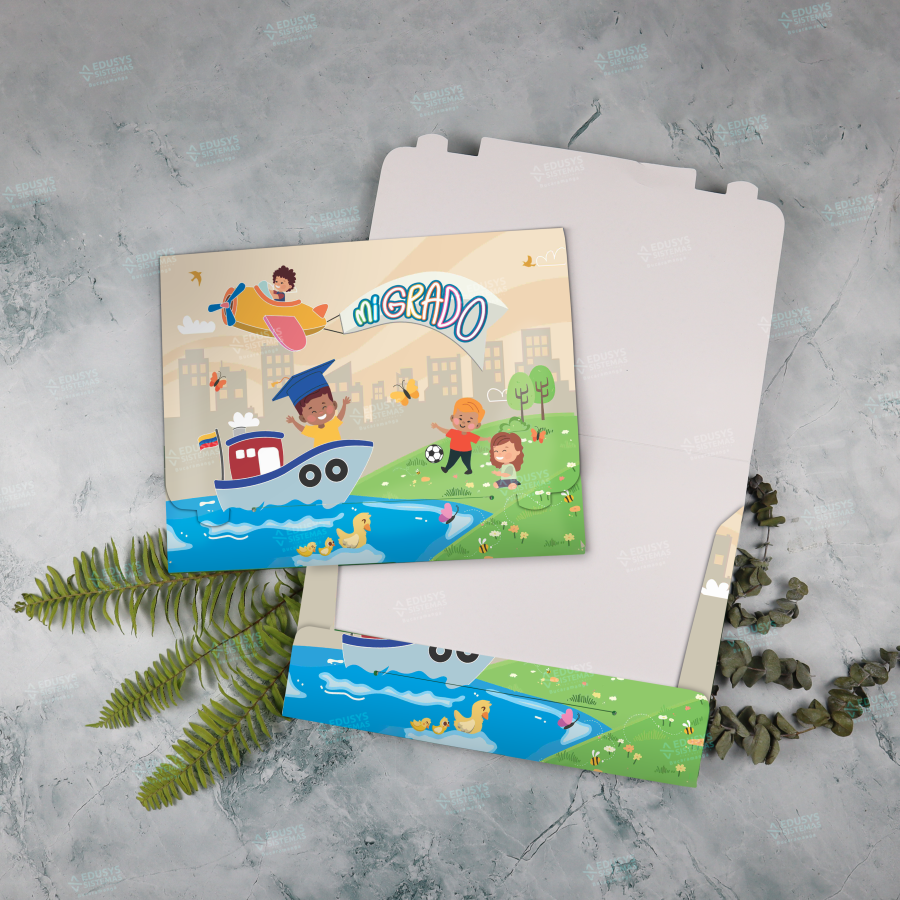 CARPETA TRES CUERPOS PERSONALIZADA 1/8 elaborada en papel Avorio de 250 gr con bolsillo para diploma y bolsillo para acta, impresa a una tinta marcada con nombre y escudo del colegio.