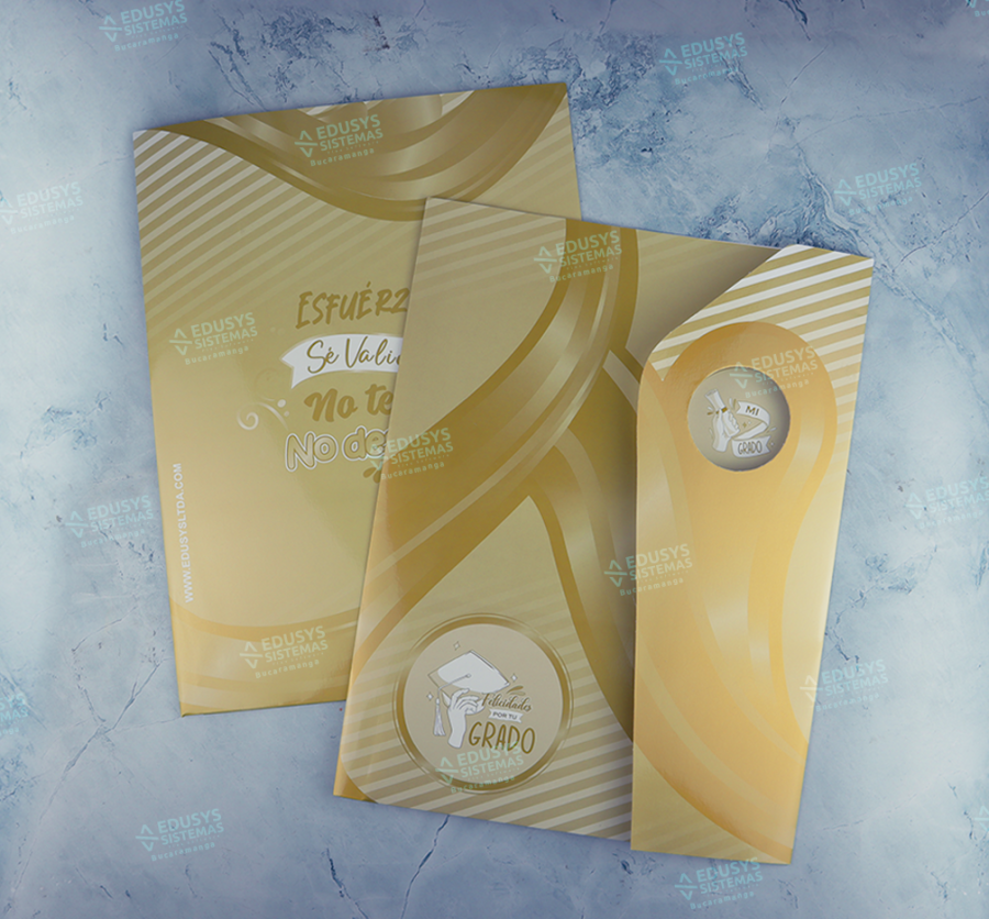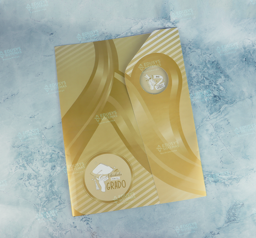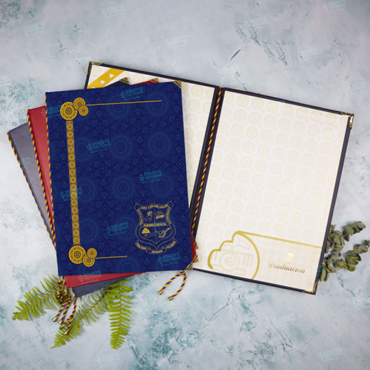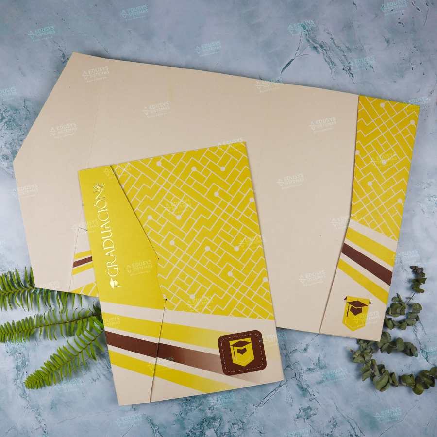 CARPETA TRES CUERPOS 1/8 Elaborada en papel ecológico de 250 gms, tres cuerpos, bolsillo para diploma y bolsillo para acta, impresa a dos tintas con apliques dorados.
