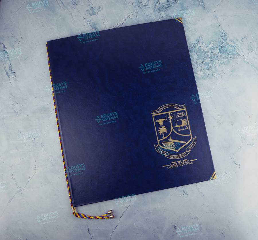 CARPETA PASTA DURA 1/6 Elaborada con cartón dos milímetros, forrada en papel de encuadernación, punteras doradas, cordón tricolor con punteras doradas, esquineros dorados para diploma, bolsillo para diploma y marcada en dorado con nombre, escudo del colegio y promoción.