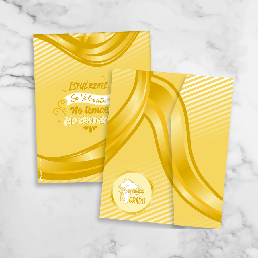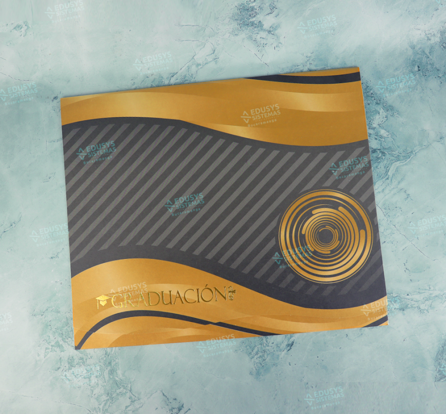 CARPETA DOS CUERPOS 1/6 Elaborada en papel ecológico con bolsillo para diploma y para acta, impresa a dos tintas con apliques dorados